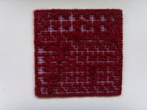 Voor het jongste projectje op plastic canvas, heb ik de stekenlap tevoorschijn gehaald om een geschikte steek uit te zoeken. Nou ja, projectje .... Het kost tamelijk wat moeite om de naald door te halen met een dikke draad acryl. Die dikke draad is nodig om het plastic canvas geheel te bedekken, anders vind ik het niet mooi.