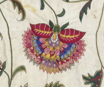 Op de bovenste foto zie je een jurk van sits uit circa 1775. De tweede en derde foto zijn afbeeldingen van een fragment van een geborduurde sprei in Aziatisch textiel uit 1720-1740.